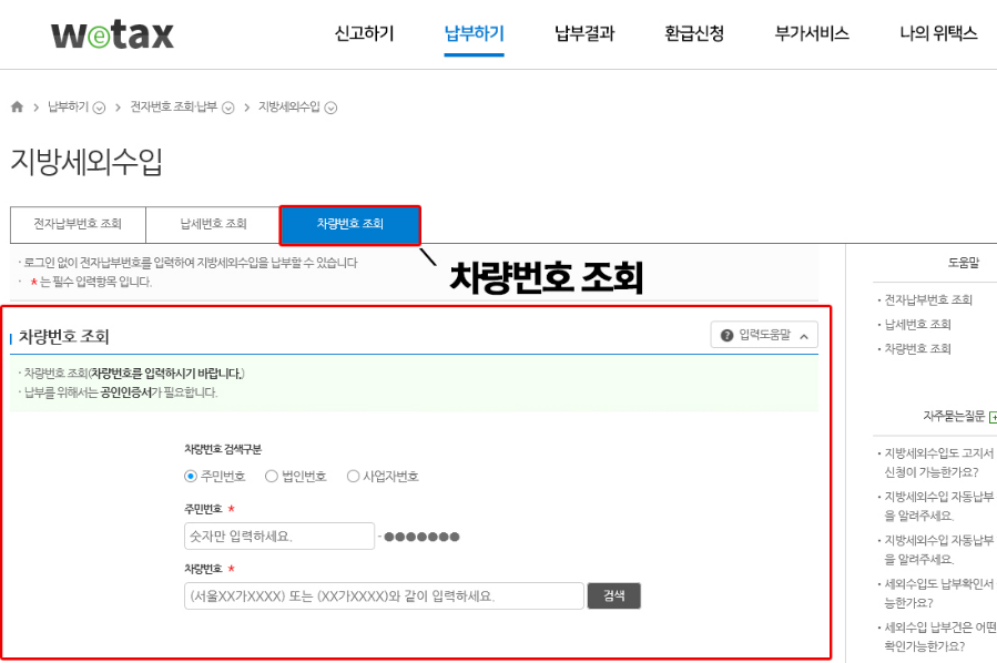 위택스 접속 -> 납부하기 -> 전자번호 조회·납부 -> 지방세외수입 클릭 -> 차량번호 조회 선택 -> 조회